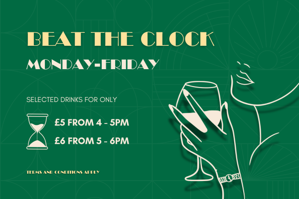 Want to control the Happy Hour? — Enjoy selected drinks for just £5 from 4–5pm, or £6 from 5–6pm, Monday to Friday.