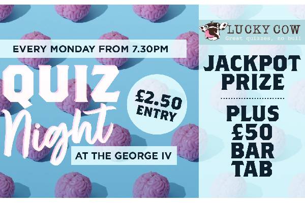 Join us every Monday night from 7:30PM to take part in The George's Quiz night! Hosted by Lucky Cow, bringing you questions that will get the cogs turning. Do you have what it takes to win the Jackpot?