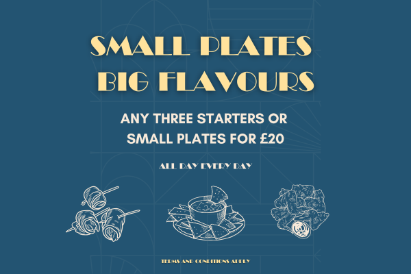 Big Flavours! Mix, match, and share the love! Choose any three starters or small plates for just £20 – available all day, every day.